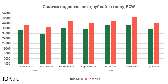 За прошедшую неделю с 21.02.2022 по 25.02.2022 средняя цена семечки подсолнечника, согласно выставленным заявкам трейдеров, упала по всем округам на 611 рублей. Средняя цена составляет 40363 рубля за тонну.