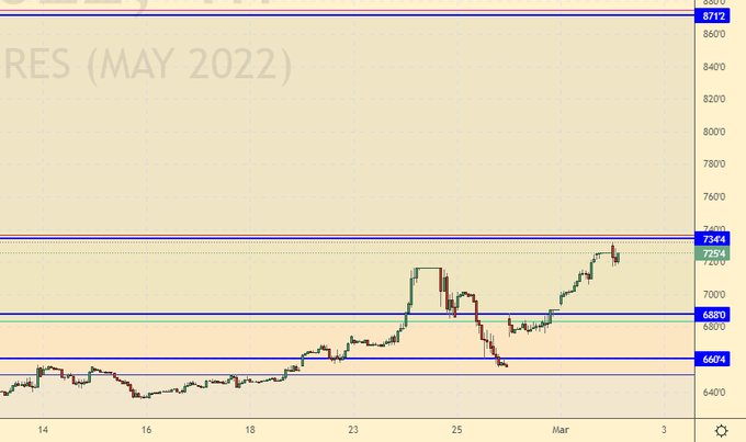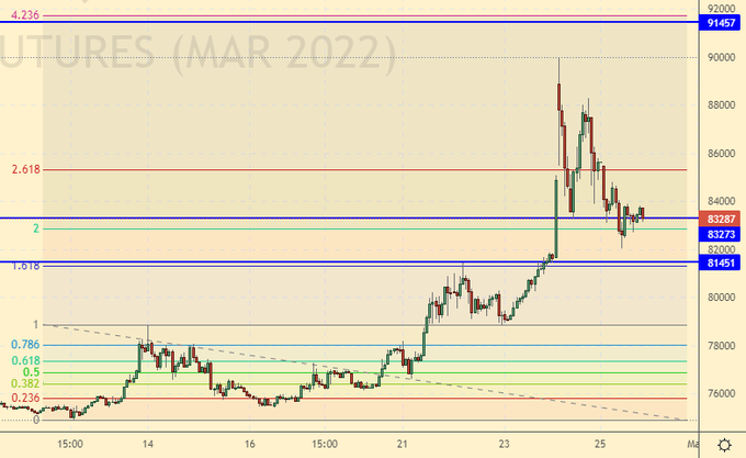 Торги на рынке акций вчера не проводились. Если сегодня они все-таки будут открыты, что ж… получим гэп вниз в район 40000. Далее прибегут мелкие спекулянты, а также деньги из бюджета в размере 1-го триллиона рублей и будут покупать. Купят всё. Но это уже не рынок. Хотя… тот, кто верит в светлое будущее будет закупаться именно сейчас на долгий срок. Но нужно верить не в нормализацию отношений с Западом, а в русское экономическое чудо в следующие 20 лет.