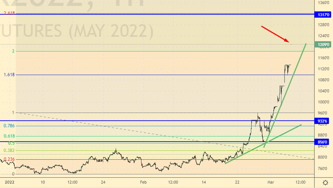 Видим, что третьи сутки рынок трясется от ужаса и растет прыжками упираясь в лимит торгов на день. У пшеницы есть все шансы достигнуть уровня 1310. Далее много будет зависеть от ситуации на Украине и отношению Запада к происходящему и к Кремлю.