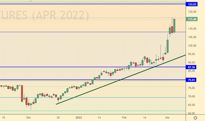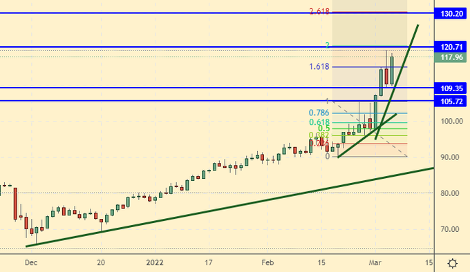 Сценарий роста: рассматриваем мартовский фьючерс, дата экспирации 31 марта. Мы легко достигли цели на 110.0. Теперь стоит рассчитывать на откат к данному уровню чтобы купить еще раз и отправиться на 130.0.