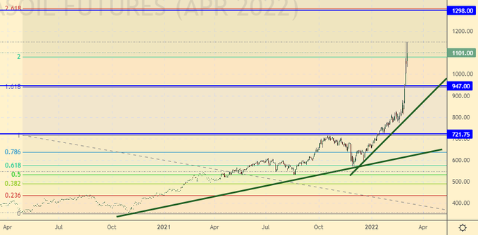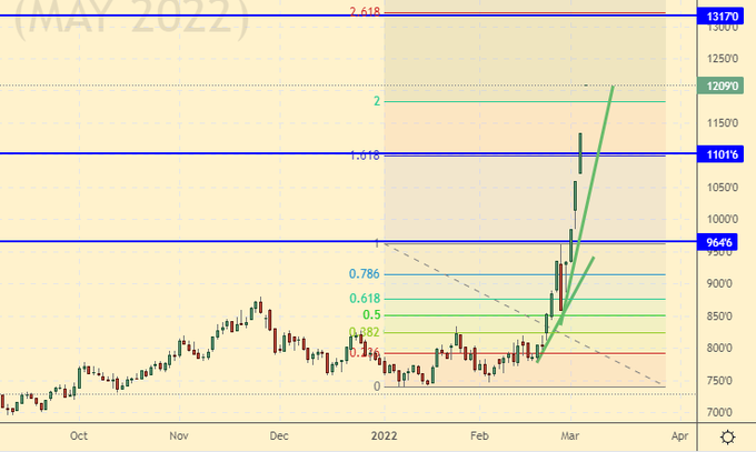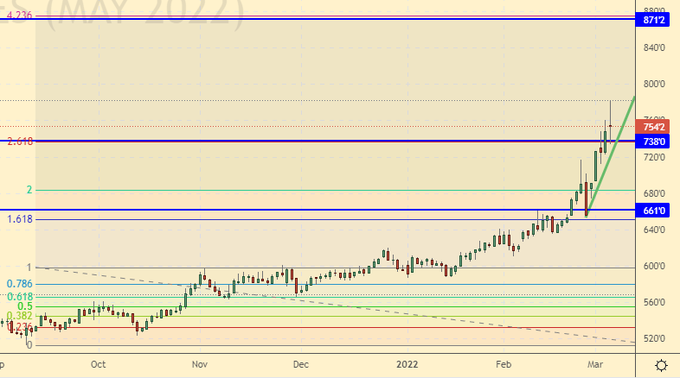 Сценарий роста: рассматриваем майский фьючерс, дата экспирации 13 мая. Будем держать лонги от 685.0. Не исключено, что кукуруза взорвется и достигнет 870.0.