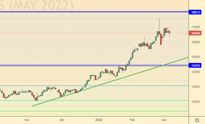Запрет на вывоз удобрений из РФ наряду с конфронтацией по линии Москва – Киев уже привел к сильному росту цен на рынке зерна, так как есть реальная угроза падения валового сбора в сезоне 22/23. Мир в течение 10 лет не знал, что такое дефицит пшеницы, спрос постоянно рос следом за предложением со скоростью 3-5% в год. Но, теперь спрос вырастет более чем на 5% год к году из-за паники, а валовый сбор рискует оказаться процентов на 15 ниже прошлого года. Это катастрофа.