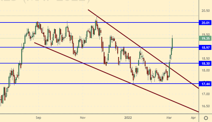 Сценарий роста: рассматриваем майский фьючерс, дата экспирации 29 апреля. Красиво мы из клина уходим наверх. Первая цель 20.00, далее 23.20. Держим лонг.