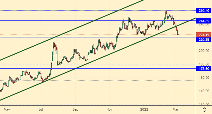 Продажа: нет. Кто в позиции от 250.0, перенесите стоп на 246.00. Цель: 200.00.