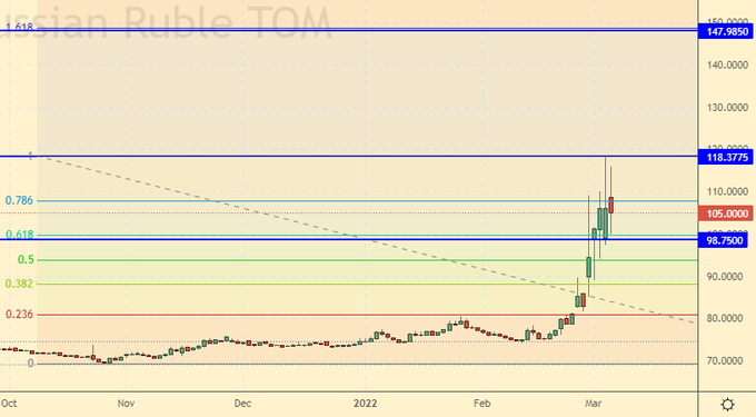 Центральный Банк на торгах пока не пустил рубль выше отметки 120.00, но если сальдо нашего платежного баланса станет отрицательным, а такие предпосылки в момент перестройки экономики есть, то рублю придется кратковременно сходить на 150.00 месяца через два – три, после чего, к концу года, мы окажемся в районе 95.00 – 100.00. Без дальнейшего нагнетания ситуации, именно эти уровни воспринимаются на данный момент как «справедливые». Если же появится свет в конце тоннеля, то на них мы можем оказаться и через две недели без какого-либо прыжка к 150.00.