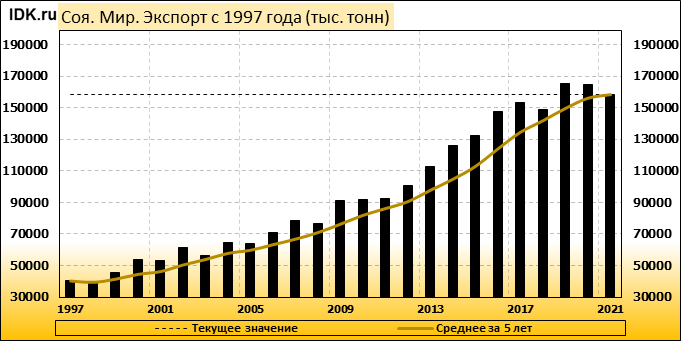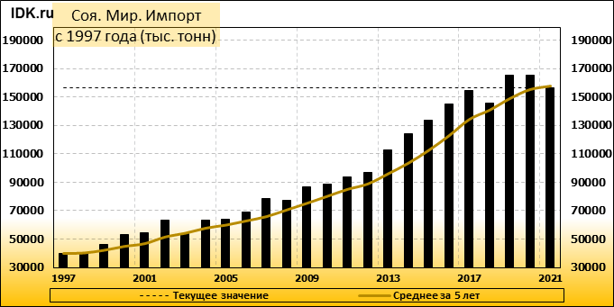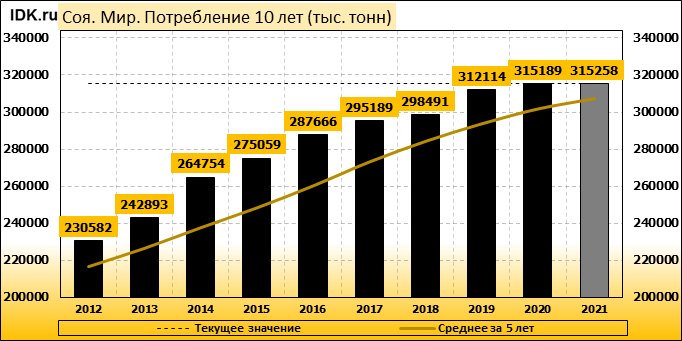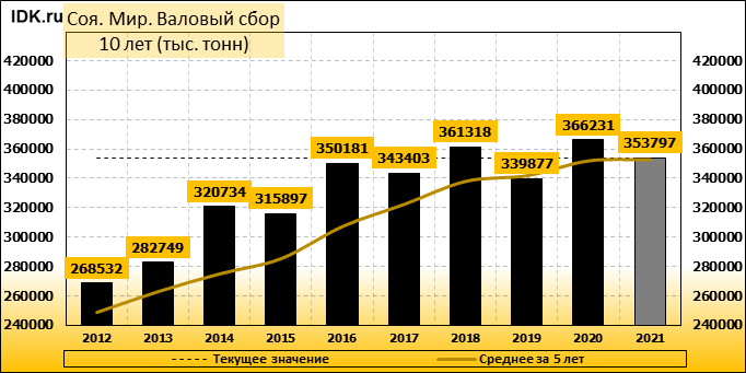 Глобальный прогноз спроса и предложения на рынке сои на 2021/22 год включают снижение производства, переработки, экспорта и остатков. Мировое производство сои сокращено на 10,1 млн тонн до 353,8 млн тонн. Урожай в Бразилии снижен на 7,0 млн тонн до 127 млн, в Аргентине — на 1,5 млн тонн до 43,5 млн, в Парагвае — на 1,0 млн тонн до 5,3 млн, а в Уругвае — на 0,6 млн тонн до 2,0 млн. Прогноз мировой торговли соей в 2021/22 году сокращен на 6,4 млн тонн до 158,6 млн, при этом снижение экспорта Южной Америки частично компенсируется ростом экспорта из США. Импорт в Китай сокращен на 3 миллиона тонн до 94 миллионов.
