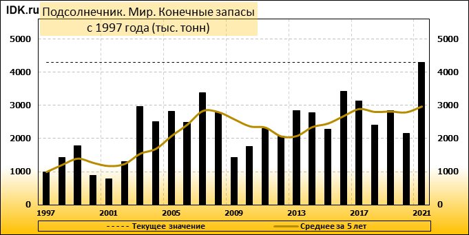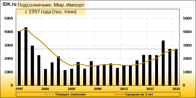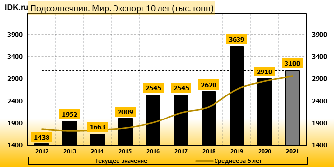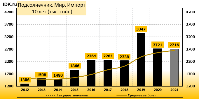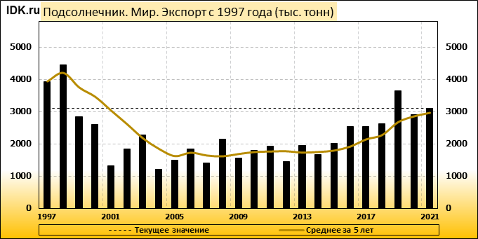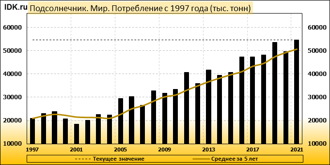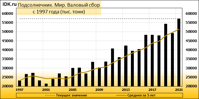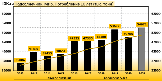 Согласно мартовскому отчету МСХ США, прогноз мирового производства подсолнечника в 2021/22 году немного снижен в этом месяце с 57,26 миллиона тонн до 57,19 млн. тонн. Тем не менее это на 7,99 миллиона тонн или 16,24 процентов больше по сравнению с оценкой производства для предыдущего 2020/21 года. При этом сокращение производства в Европейском Союзе и Аргентине частично компенсируется повышением прогноза производства для России. Переработка подсолнечника снижена на 2,2 млн в основном за счет Украины. Основные рынки, на которые повлияло снижение объемов переработки и экспорта подсолнечника из Украины, включают Индию и ЕС.