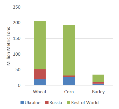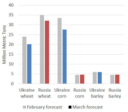 Конфликт в Черноморском регионе нарушил потоки зерна из региона и вызвал большую неопределенность на мировом рынке зерна. Украина с 24 февраля приостановила портовые операции для коммерческой деятельности. На перемещение российского зерна через Черное море также влияют исключительно высокие страховые взносы для судов. Кроме того, примененные санкции затрудняют коммерческие транзакции. В ответ резко выросли цены на зерно у всех основных экспортеров. Прогноз на этот месяц представляет собой первоначальную оценку краткосрочных последствий этих событий. Пшеница, кукуруза и ячмень являются основными зерновыми культурами, поставляемыми Украиной и Россией.