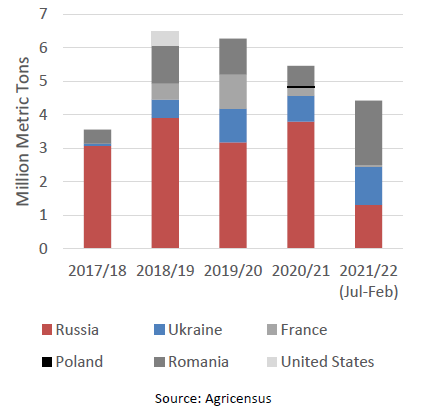 Египет, крупнейший импортер пшеницы в мире, постоянно закупает большие объемы российской и украинской пшеницы для удовлетворения своих потребностей. В первой половине торгового года почти 80 процентов импорта Египта приходилось на Украину или Россию, в том числе закупки частного сектора, на которые приходится почти половина общего годового импорта пшеницы.