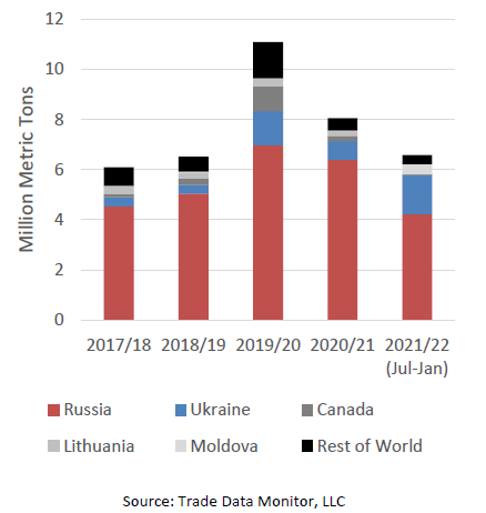 Даже с дополнительными мерами по диверсификации поставок пшеницы рост мировых цен будет ограничить возможности Египта по закупке больших объемов пшеницы из международных источников. В феврале GASC отменил два тендера из-за малого количества участников и высоких цен. Египет, чувствительный к ценам рынок, может больше полагаться на пшеницу, которую он уже закупил, в течение оставшейся части торгового года. В настоящее время государственные резервы пшеницы для программы продовольственных субсидий покрывают 4,5 месяца потребления. Египет продолжает строить новые элеваторы и расширять свои складские мощности, что в конечном итоге может позволить Египту ограничить импорт и переждать скачки цен. Кроме того, дополнительные реформы программы субсидирования хлеба могут снизить спрос на импорт. Учитывая объем импорта на сегодняшний день и проблемы с высокими ценами и альтернативными поставщиками, импорт Египта в этом месяце снижен на 500 000 тонн до 12,5 миллионов.
