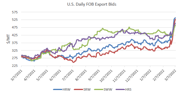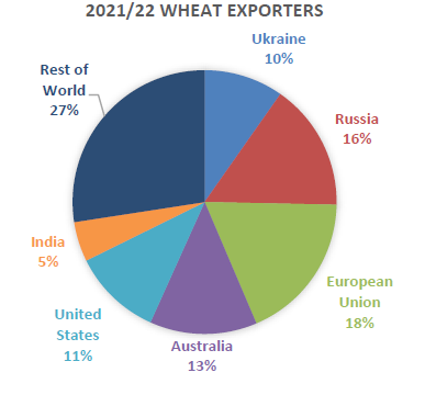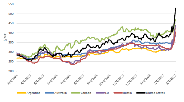 После начала российской военной операции в Украине 24 февраля мировые цены на пшеницу всех основных экспортеров совершили беспрецедентный скачок как на наличных, так и на фьючерсных рынках, поскольку импортеры ищут новых поставщиков пшеницы. Канадские котировки подскочили на 60 долларов за тонну по сравнению с предыдущим месяцем, что также отражает сокращение запасов из-за прошлогодней засухи. Австралийские цены выросли меньше всего, на $47 за тонну, так как обильные запасы нового урожая предотвратили существенный рост цен. Аргентинские цены выросли на $116 за тонну благодаря активным закупкам со стороны Бразилии и нескольких рынков Африки, Ближнего Востока и Юго-Восточной Азии. Котировки в США взлетели на $162 за тонну, что также отражает продолжающуюся сухую погоду в Канзасе, Оклахоме и Техасе, которая вызвала обеспокоенность состоянием посевов озимой пшеницы. Цены в ЕС выросли на 150 долларов за тонну на ожиданиях высокого спроса со стороны Ближнего Востока и Северной Африки, при этом Алжир заявил, что позволит Франции снова участвовать в будущих тендерах. Российские котировки выросли на $87/т, хотя спрос был ограничен санкциями и трудностями со страховкой судов.