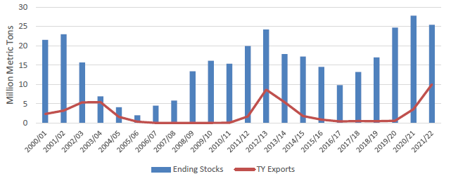 Рисунок 9. Экспорт и остатки пшеницы в Индии