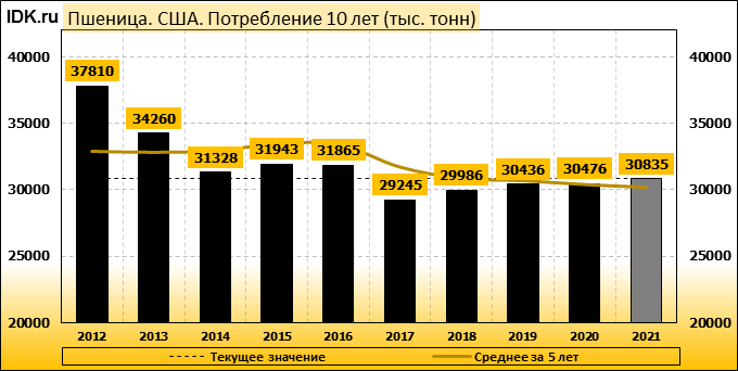 Прогноз спроса и предложения на рынке пшеницы в США на 2021/22 год предполагает снижение предложения, неизменное внутреннее потребление, сокращение экспорта и увеличение конечных остатков. Предложение снижено за счет сокращения импорта на 5 миллионов бушелей. Экспорт сокращен на 10 миллионов бушелей до 800 миллионов из-за более слабых, чем ожидалось, продаж и отгрузок Hard Red Winter и Soft Red Winter. Прогнозируемые остатки на конец сезона 2021/22 увеличены на 5 миллионов бушелей до 653 миллионов, но все еще на 23 процента ниже, чем в прошлом году.