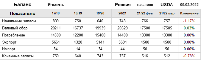 За прошедший месяц министерство сельского хозяйства США (USDA) на 09.03.2022 пересмотрело Баланс ячменя для России в сезоне 21/22 следующим образом: