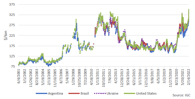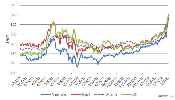 После публикации февральского отчета WASDE цены всех четырех основных экспортеров резко выросли. Продолжающиеся военные действия на Украине нарушили работу портов и коммерческую деятельность в Черноморском регионе, повысив уровень неопределенности на мировом рынке кукурузы. В результате украинские цены выросли на 56 долларов за тонну до 340 долларов, хотя спрос, вероятно, будет ограничен в сложившихся обстоятельствах. Кукуруза нового урожая из Южной Америки поступит на рынок через несколько месяцев, и критические месяцы для выращивания второго урожая из Бразилии (сафринья) еще впереди. В сочетании с сохраняющимся спросом на старый урожай аргентинские цены выросли на 61 доллар за тонну до 343 долларов, а бразильские — на 52 доллара за тонну до 349 долларов. На фоне этих глобальных опасений цены в США выросли на 58 долларов за тонну до 353 долларов.