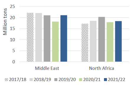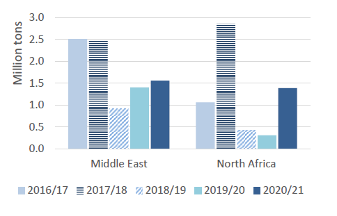 Все страны региона зависят от импорта для удовлетворения растущего спроса на корма для животноводства (например, птицы, крупного рогатого скота, овец и коз), и львиная доля роста импорта приходится на Иран, Турцию и Саудовскую Аравию. Иран является главным направлением поставок кукурузы из Бразилии. Хотя информации о спросе на корма в Иране мало, самые последние статистические данные Продовольственной и сельскохозяйственной организации показывают, что производство мяса в Иране в 2020 году выросло на 10 процентов по сравнению с предыдущим годом, при значительном росте поголовья крупного рогатого скота, овец и коз. Турция разрешила беспошлинный импорт кукурузы и других зерновых с сентября прошлого года, и эта мера была продлена до конца 2022 года с целью сдерживания продовольственной инфляции на внутреннем рынке. Турция активно покупала кукурузу и ячмень, хотя обесценивание лиры по отношению к другим валютам делает импорт дорогостоящим. В Саудовской Аравии предпринимаются постоянные усилия по повышению эффективности кормов за счет предложения комбикормов по конкурентоспособным ценам по сравнению с непереработанным ячменем. Ожидается, что кукуруза имеет более высокую энергетическую ценность в кормовых рационах, что повысит спрос на кукурузу.