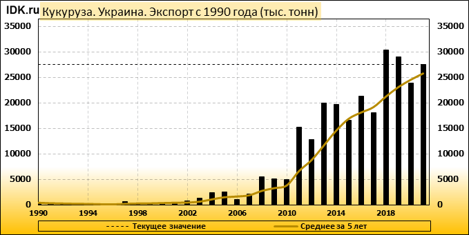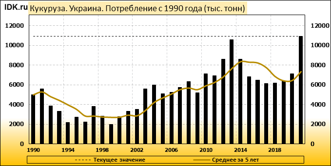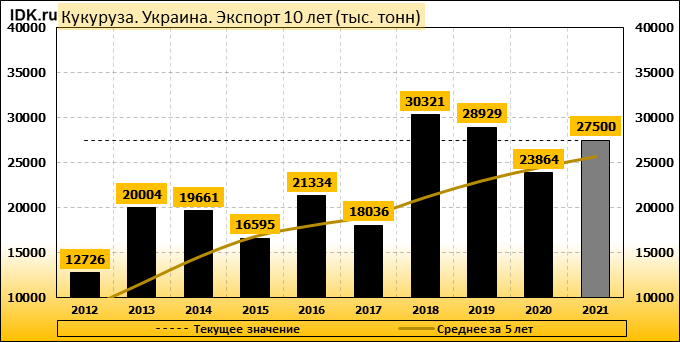 Производство кукурузы в Украине в 2021/22 маркетинговом году сокращено с прошлого месяца на 0,10 млн тонн до 41,90 млн метрических тонн, что на 11,60 млн тонн или на 38% больше, чем было произведено в предыдущем году. При этом урожайность снижена с 7,92 до 7,67 тонны с гектара. Уборочная площадь повышена с 5,3 до 5,47 миллиона гектаров. Прогноз экспорта кукурузы из Украины в 2021/22 году резко сокращен в этом месяце на 6 млн тонн до 27,5 млн тонн по причине приостановки работы портов в условиях продолжающихся военных действий в стране.