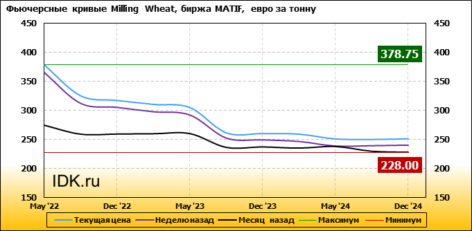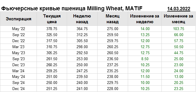 На 14.03.2022 стоимость пшеницы Milling Wheat на бирже MATIF по контракту May ’22 составила 378.75 евро за тонну. За прошедшую неделю стоимость пшеницы Milling Wheat выросла на 14 евро/тонна. Как мы видим на графике, фьючерсная кривая имеет периоды, когда более дальний фьючерс дешевле ближнего. Состояние бэквардации наблюдаем на следующих контрактах: Sep ’22; Dec ’22; Mar ’23; May ’23; Sep ’23; Dec ’23; Mar ’24; May ’24; Sep ’24. Таким образом, трейдеры предполагают, что возможно превалирование предложения над спросом в указанные периоды.