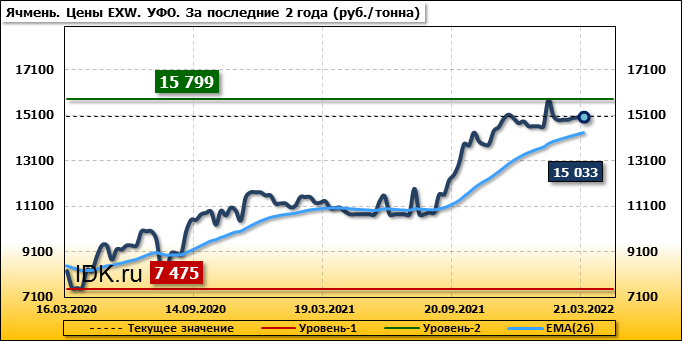 Внутренние цены на ячмень в Уральском федеральном округе выросли на 17 руб./т. и на данный момент составляют 15033 рубля за тонну.