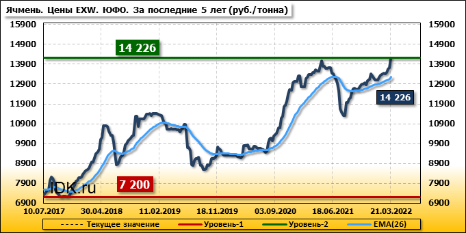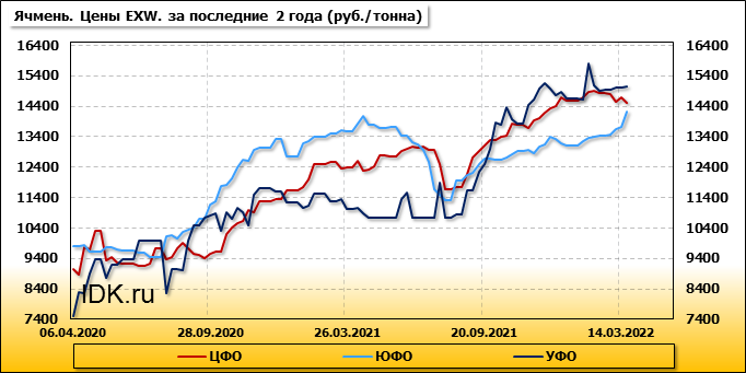 В Южном федеральном округе внутренние цены на ячмень выросли на 504 руб./т. и на данный момент составляют 14226 рублей за тонну.