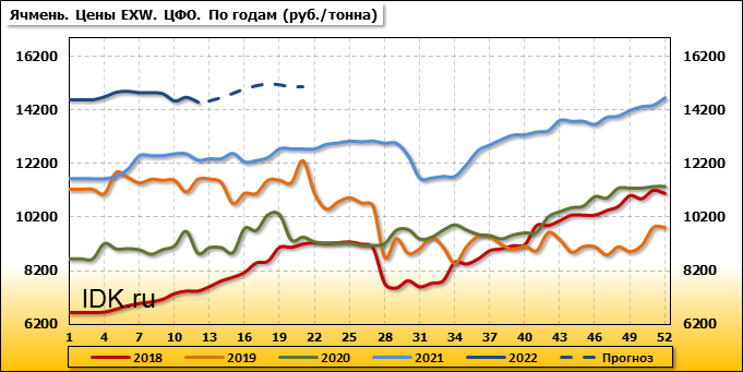 За прошедшую неделю в Центральном федеральном округе внутренние цены на ячмень упали на 177 руб./т. и на данный момент составляют 14496 рублей за тонну.