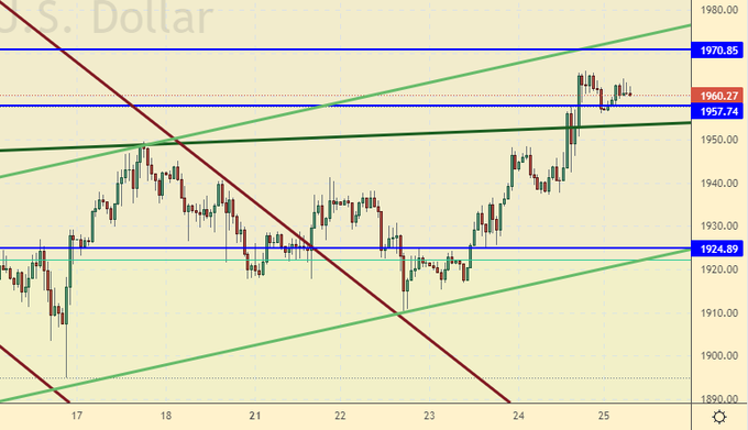 Отличные уровни для входа в шорт. Продажа от 1970 будет идеальной. Есть признаки того, что сырьевой рынок немного отступит, по золоту падение, в припадке поклонения доллару, может быть больше, чем по зерну или нефти.