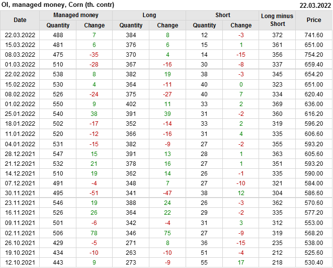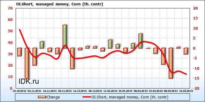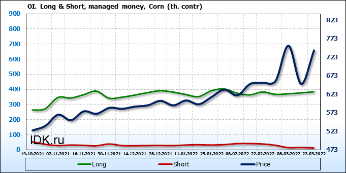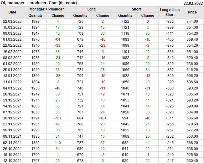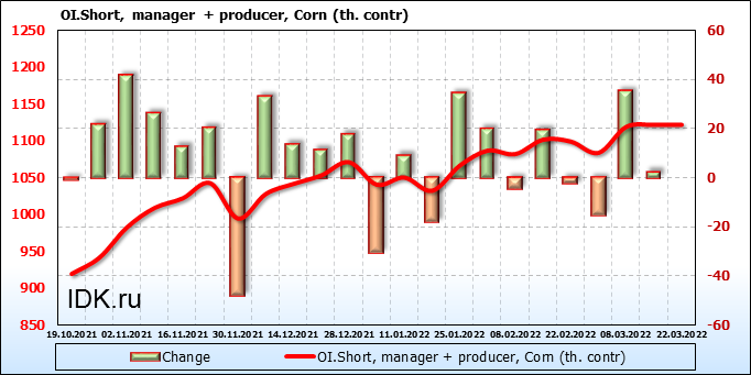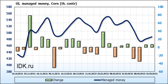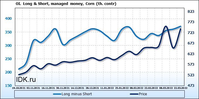 За прошлую неделю, 16.03.22 — 22.03.22, разница между длинными и короткими позициями управляющих увеличилась на 10.7 тыс. контрактов. В тоже время, цена выросла на 90.6 цента.