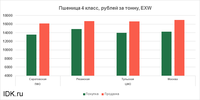 За прошедшую неделю с 21.03.2022 по 25.03.2022 средняя цена на пшеницу 4-го класса, согласно выставленным заявкам трейдеров, выросла по всем округам на 279 рублей. Средняя цена составляет 15170 рублей за тонну.