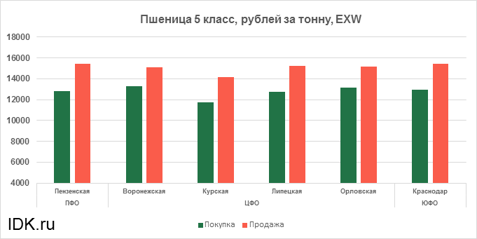 За прошедшую неделю с 21.03.2022 по 25.03.2022 средняя цена на пшеницу 5-го класса, согласно выставленным заявкам трейдеров, выросла по всем округам на 320 рублей. Средняя цена составляет 14103 рубля за тонну.