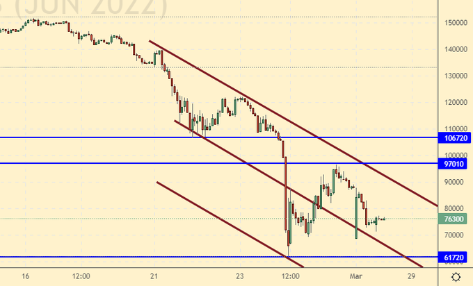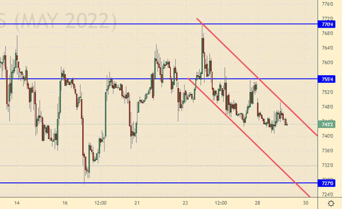 Видим технические предпосылки для хода вниз. Имеет смысл продать в случае падения ниже 739.0. Рынок вряд ли уйдет ниже 600.0, но до данного уровня мы отступить способны даже на фоне конфликта на Украине.