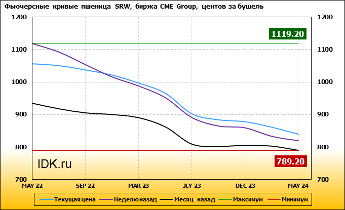 На 28.03.2022 стоимость пшеницы SRW на бирже CME Group по контракту MAY 22 составила 1057 центов за бушель. За прошедшую неделю стоимость пшеницы SRW упала на 62.2 цента/бушель. Как мы видим на графике, фьючерсная кривая имеет периоды, когда более дальний фьючерс дешевле ближнего. Состояние бэквардации наблюдаем на следующих контрактах: JLY 22; SEP 22; DEC 22; MAR 23; MAY 23; JLY 23; SEP 23; DEC 23; MAR 24; MAY 24. Таким образом, трейдеры предполагают, что возможно превалирование предложения над спросом в указанные периоды.