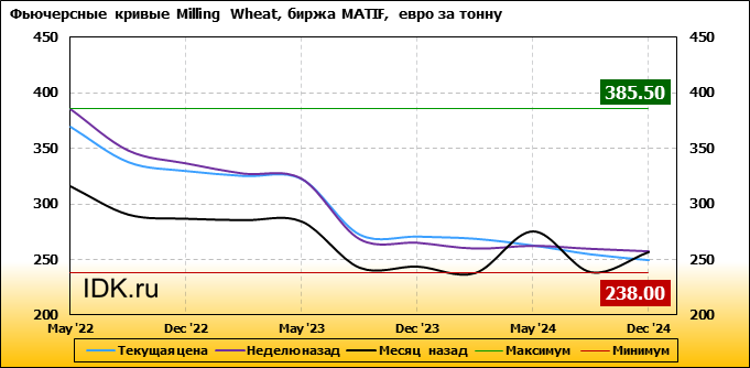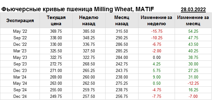 На 28.03.2022 стоимость пшеницы Milling Wheat на бирже MATIF по контракту May ’22 составила 369.75 евро за тонну. За прошедшую неделю стоимость пшеницы Milling Wheat упала на 15.75 евро/тонна. Как мы видим на графике, фьючерсная кривая имеет периоды, когда более дальний фьючерс дешевле ближнего. Состояние бэквардации наблюдаем на следующих контрактах: Sep ’22; Dec ’22; Mar ’23; May ’23; Sep ’23; Dec ’23; Mar ’24; May ’24; Sep ’24; Dec ’24. Таким образом, трейдеры предполагают, что возможно превалирование предложения над спросом в указанные периоды.