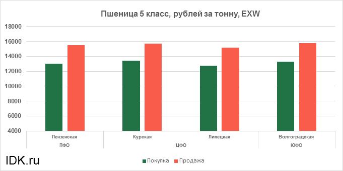 За прошедшую неделю с 28.03.2022 по 01.04.2022 средняя цена на пшеницу 5-го класса, согласно выставленным заявкам трейдеров, выросла по всем округам на 190 рублей. Средняя цена составляет 14294 рубля за тонну.