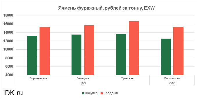За прошедшую неделю с 28.03.2022 по 01.04.2022 средняя цена на фуражный ячмень, согласно выставленным заявкам трейдеров, упала по всем округам на 331 рубль. Средняя цена составляет 14190 рублей за тонну.