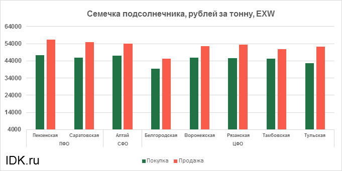 За прошедшую неделю с 28.03.2022 по 01.04.2022 средняя цена семечки подсолнечника, согласно выставленным заявкам трейдеров, упала по всем округам на 1514 рублей. Средняя цена составляет 50050 рублей за тонну.