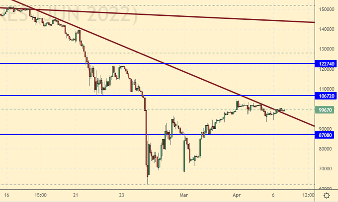 Продажа: нет. Кто в позиции от 103000 и 105000, держите стоп на 107000. Цель: 50000.