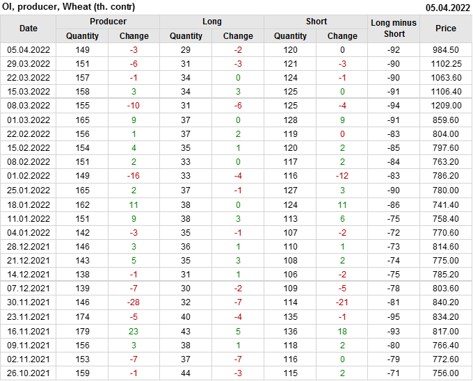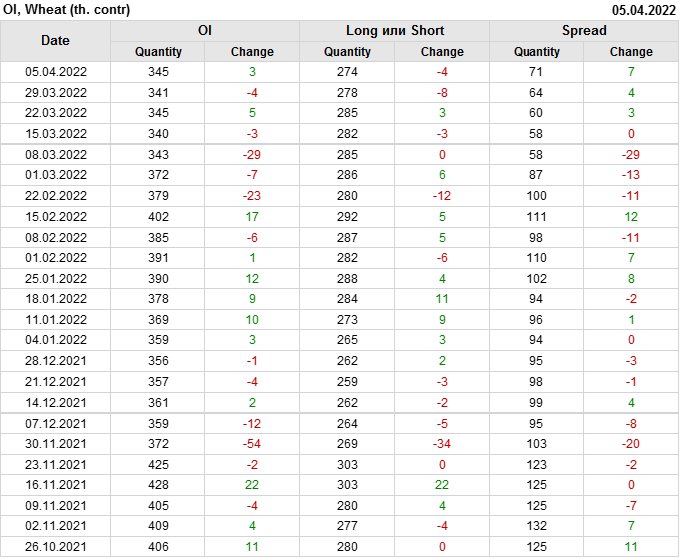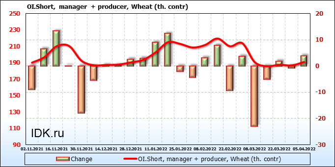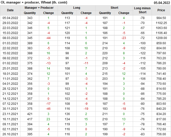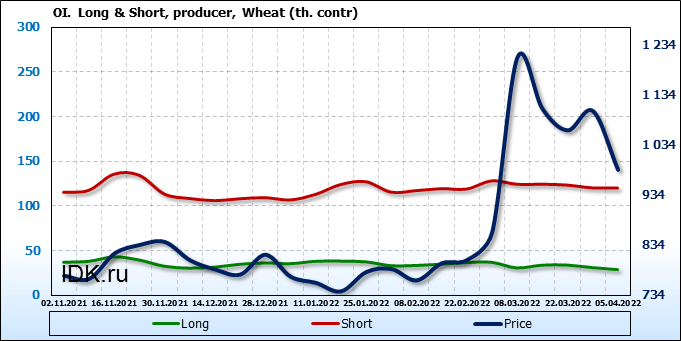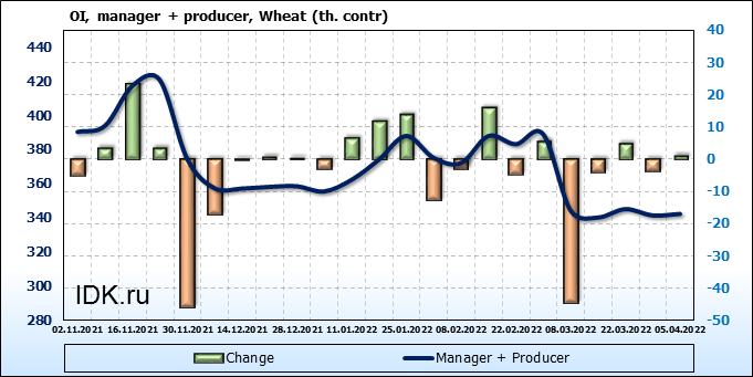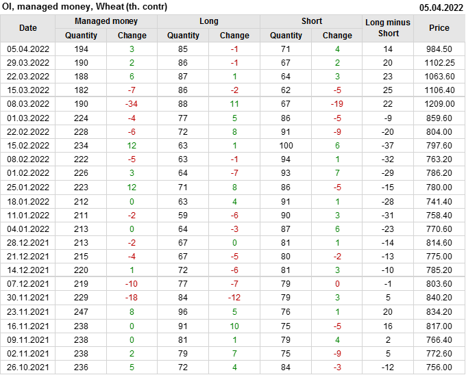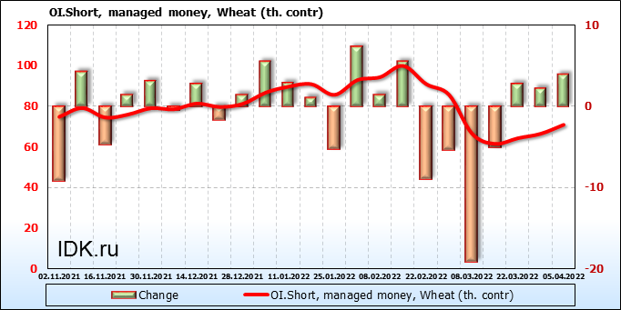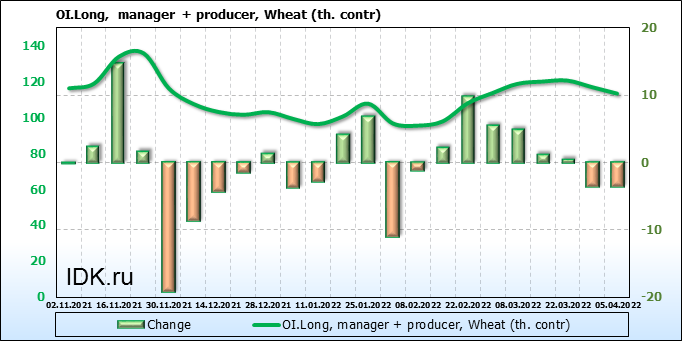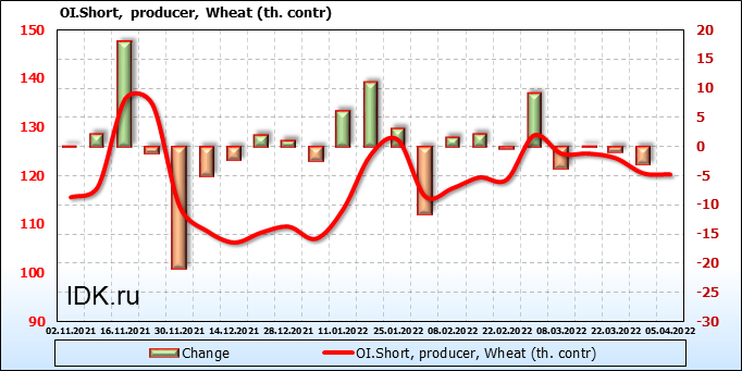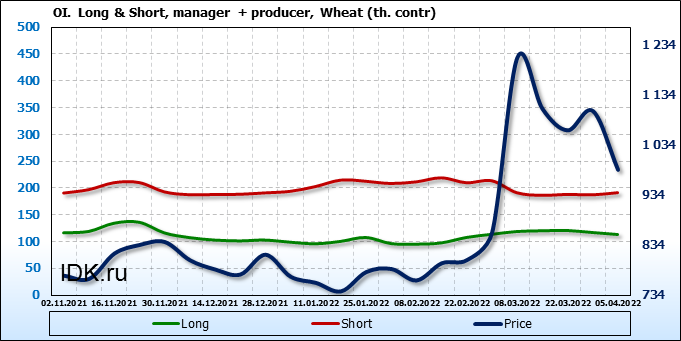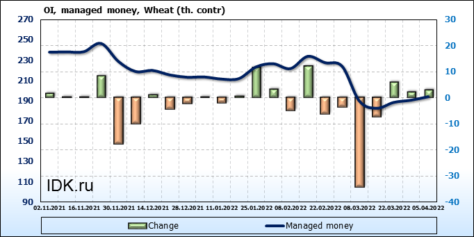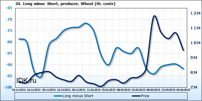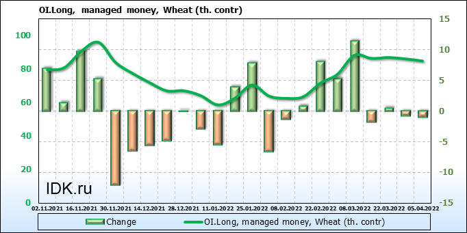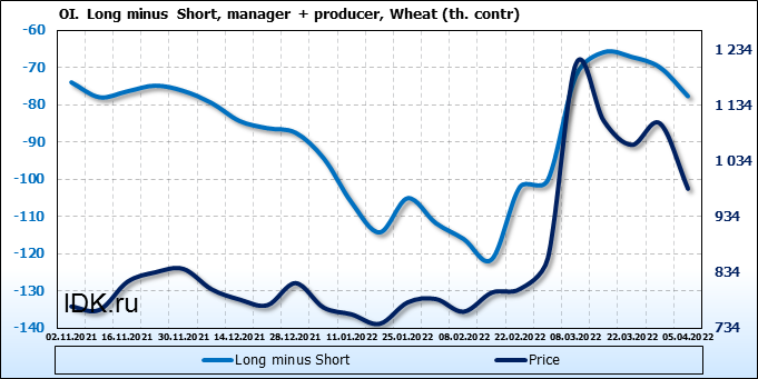 За прошедшую неделю, 30.03.22 — 05.04.22, разница между длинными и короткими позициями управляющих сократилась на 5.7 тыс. контрактов. В тоже время, цена упала на 117.75 цента.