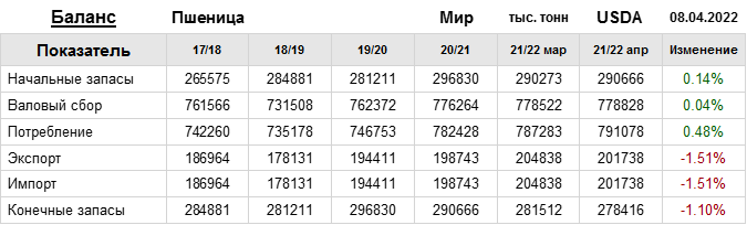 За прошедший месяц министерство сельского хозяйства США (USDA) на 08.04.2022 пересмотрело Баланс пшеницы для Мира в сезоне 21/22 следующим образом: