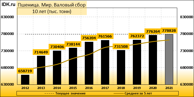 Мировой прогноз по пшенице на 2021/22 год предполагает небольшое увеличение запасов, повышение потребления, сокращение объемов торговли и сокращение конечных остатков. Запасы увеличены на 0,7 млн тонн до 1 069,5 млн благодаря сочетанию более высоких начальных запасов для Пакистана, Бразилии и Саудовской Аравии и более высокого производства для Пакистана и Аргентины, что более чем компенсирует снижение производства в ЕС. Прогнозируемое мировое потребление в 2021/22 году повышено на 3,8 миллиона тонн до 791,1 миллиона, в основном за счет увеличения продовольственного и промышленного потребления (FSI) в Индии.