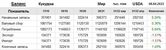 За прошедший месяц министерство сельского хозяйства США (USDA) на 08.04.2022 пересмотрело Баланс кукурузы для Мира в сезоне 21/22 следующим образом: