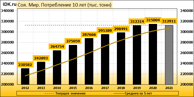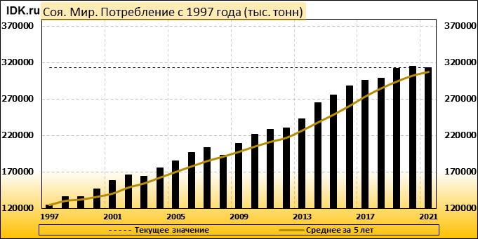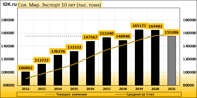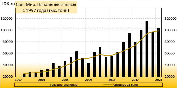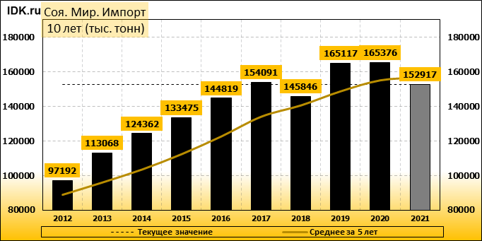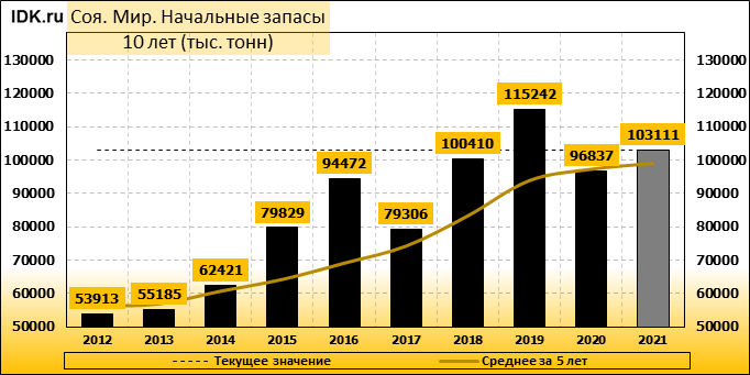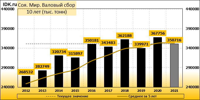 Прогнозы глобального спроса и предложения сои на 2021/22 год включают снижение производства, переработки, торговли и конечных остатков. Мировое производство сои сокращено на 3,1 млн тонн до 350,7 млн из-за уменьшения производства в Бразилии и Парагвае. Импорт сои в Китай также сокращен на 3 млн тонн до 91 млн. Снижение экспорта сои для Бразилии, Парагвая, России и Украины частично компенсируется увеличением поставок США. Мировые остатки сои снижены на 0,4 млн тонн до 89,6 млн в основном из-за снижения остатков в США и Аргентине.