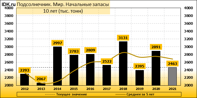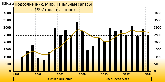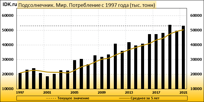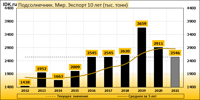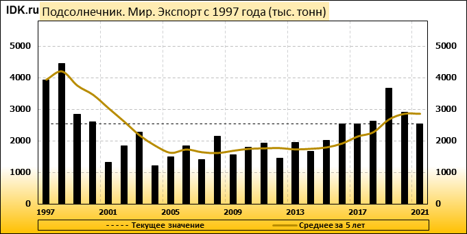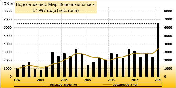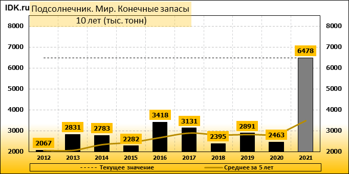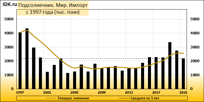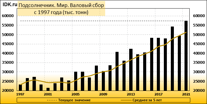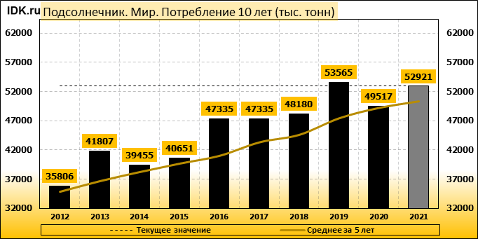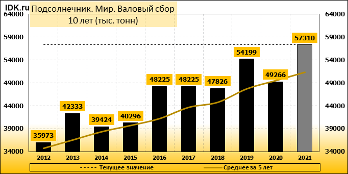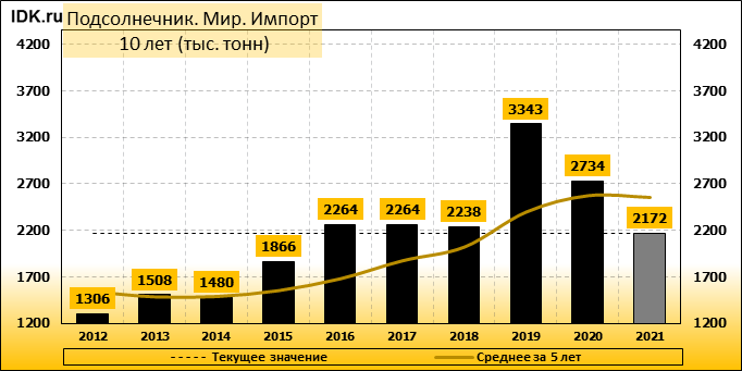 Согласно апрельскому отчету МСХ США, прогноз мирового производства подсолнечника в 2021/22 году немного повышен в этом месяце с 57,19 миллиона тонн до 57,31 млн. тонн. Это на 8,04 миллиона тонн или 16,33 процентов больше по сравнению с оценкой производства для предыдущего 2020/21 года. При этом повышение производства в Европейском Союзе частично нивелируется сокращением прогноза производства для Пакистана. Прогноз импорта подсолнечника снижен для ЕС и Турции из-за сокращения экспорта из Украины и России.