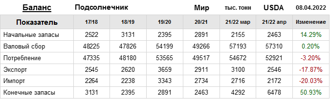 За прошедший месяц министерство сельского хозяйства США (USDA) на 08.04.2022 пересмотрело Баланс подсолнечника для Мира в сезоне 21/22 следующим образом: