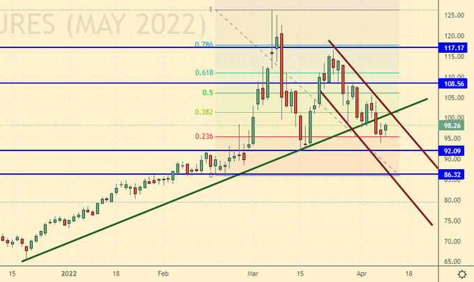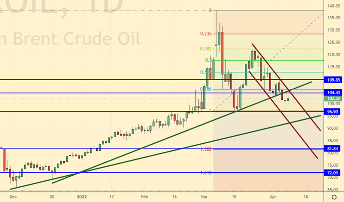 Сценарий роста: рассматриваем майский фьючерс, дата экспирации 20 апреля. На текущих уровнях можно купить. В случае роста рынка выше 107.00 можно нарастить лонг.