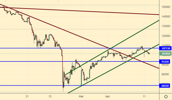 Продажа: нет. Кто в позиции от 100000, перенесите стоп на 107400. Цель: 50000.