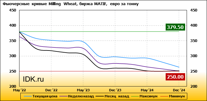 На 11.04.2022 стоимость пшеницы Milling Wheat на бирже MATIF по контракту May ’22 составила 379.5 евро за тонну. За прошедшую неделю стоимость пшеницы Milling Wheat выросла на 15.75 евро/тонна. Как мы видим на графике, фьючерсная кривая имеет периоды, когда более дальний фьючерс дешевле ближнего. Состояние бэквардации наблюдаем на следующих контрактах: Sep ’22; Dec ’22; Mar ’23; May ’23; Sep ’23; Dec ’23; Mar ’24; Sep ’24; Dec ’24. Таким образом, трейдеры предполагают, что возможно превалирование предложения над спросом в указанные периоды.