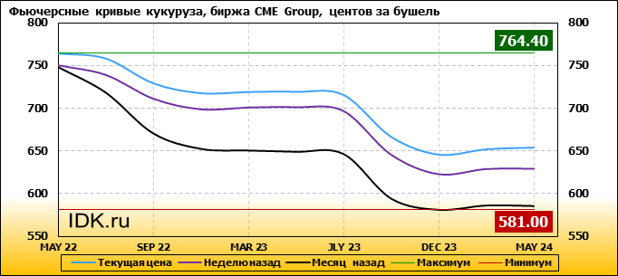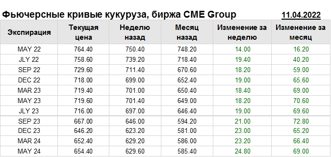 На 11.04.2022 стоимость кукурузы на бирже CME Group по контракту MAY 22 составила 764.4 цента за бушель. За прошедшую неделю стоимость кукурузы на площадке CME Group выросла на 14 центов/бушель. Как мы видим на графике, фьючерсная кривая имеет периоды, когда более дальний фьючерс дешевле ближнего. Состояние бэквардации наблюдаем на следующих контрактах: JLY 22; SEP 22; DEC 22; JLY 23; SEP 23; DEC 23. Таким образом, трейдеры предполагают, что возможно превалирование предложения над спросом в указанные периоды.