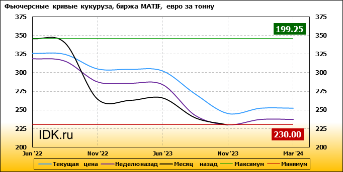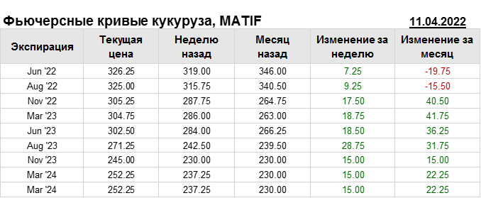 На 11.04.2022 стоимость кукурузы на бирже MATIF по контракту Jun ’22 составила 326.25 евро за тонну. За прошедшую неделю стоимость кукурузы на европейской площадке выросла на 7.25 евро/тонна. Как мы видим на графике, фьючерсная кривая имеет периоды, когда более дальний фьючерс дешевле ближнего. Состояние бэквардации наблюдаем на следующих контрактах: Aug ’22; Nov ’22; Mar ’23; Jun ’23; Aug ’23; Nov ’23. Таким образом, трейдеры предполагают, что возможно превалирование предложения над спросом в указанные периоды.