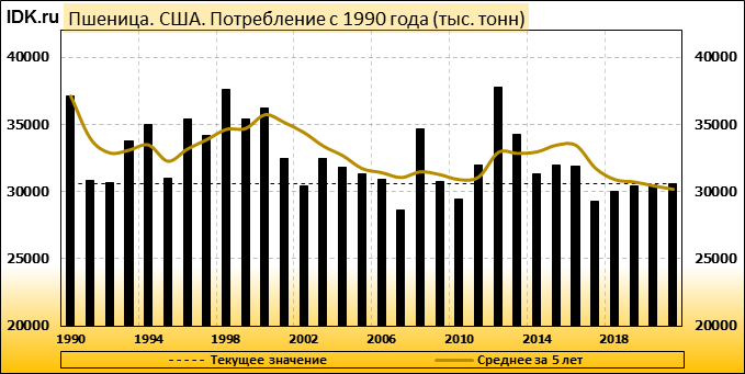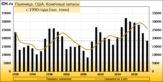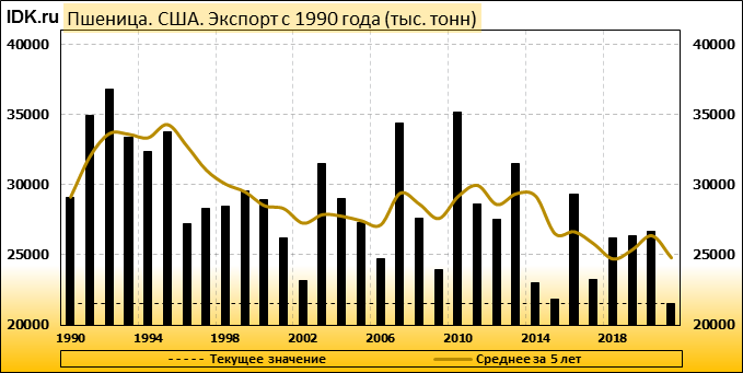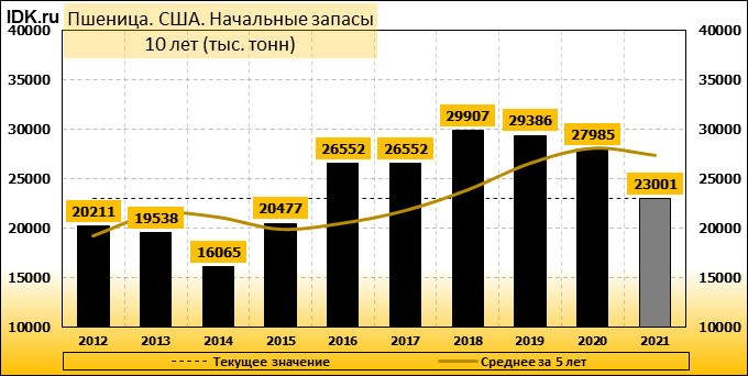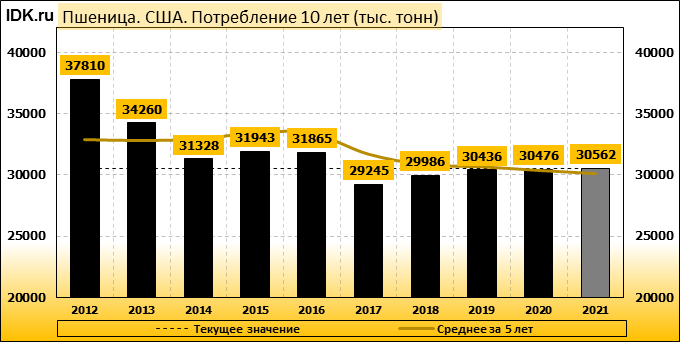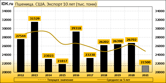 Прогноз для американского рынка пшеницы на 2021/22 год в этом месяце заключается в неизменном уровне запасов, снижении внутреннего потребления, сокращении экспорта и увеличении конечных остатков. Годовое кормовое и остаточное потребление снижено на 10 миллионов бушелей до 100 миллионов. Экспорт снижен на 15 млн бушелей до 785 млн, поскольку США остаются неконкурентоспособными на большинстве рынков, и их экспорт будет самым низким с 2015/16 года. Прогноз остатков на конец 2021/22 года повышен на 25 миллионов бушелей до 678 миллионов, но все еще на 20 процентов ниже, чем в прошлом году.
