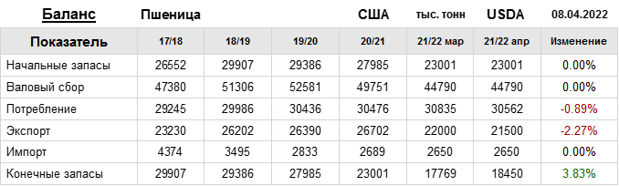 За прошедший месяц министерство сельского хозяйства США (USDA) на 08.04.2022 пересмотрело Баланс пшеницы для США в сезоне 21/22 следующим образом:
